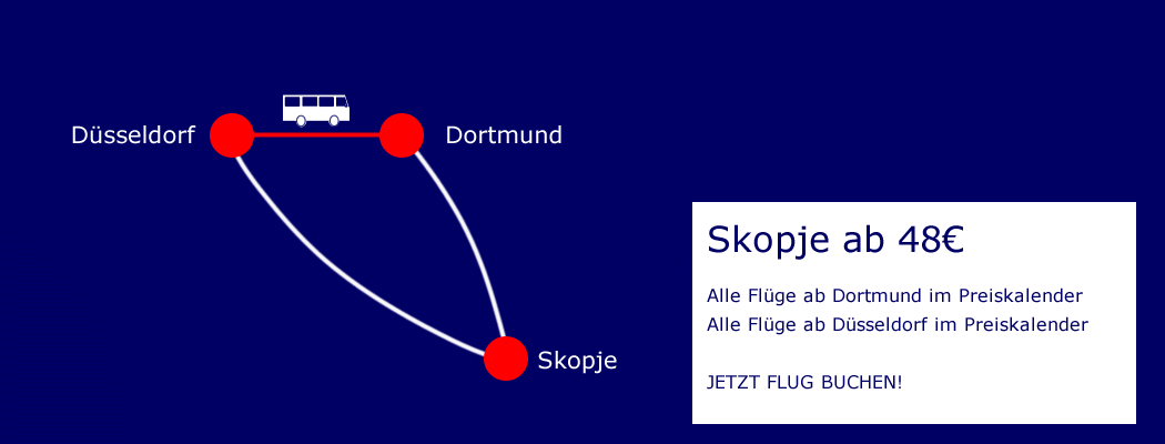 Die Strecke Düsseldorf Skopje wird einmal wöchentlich samstag von Air Prishtina angeboten. Die Flugzeit beträgt rund 2:30 stunden und unterscheidet sich gegenüber den Billigfliegern im Service.